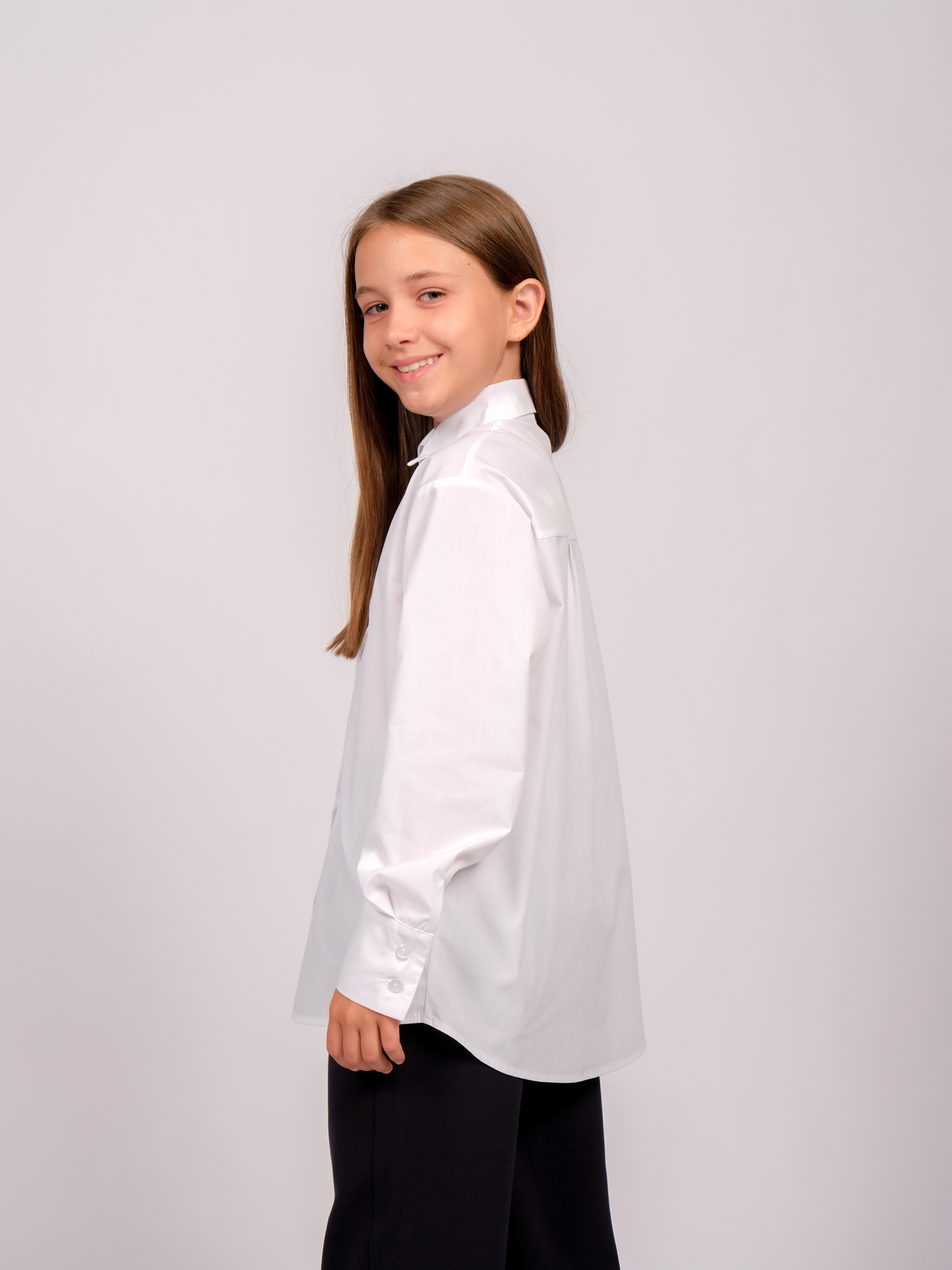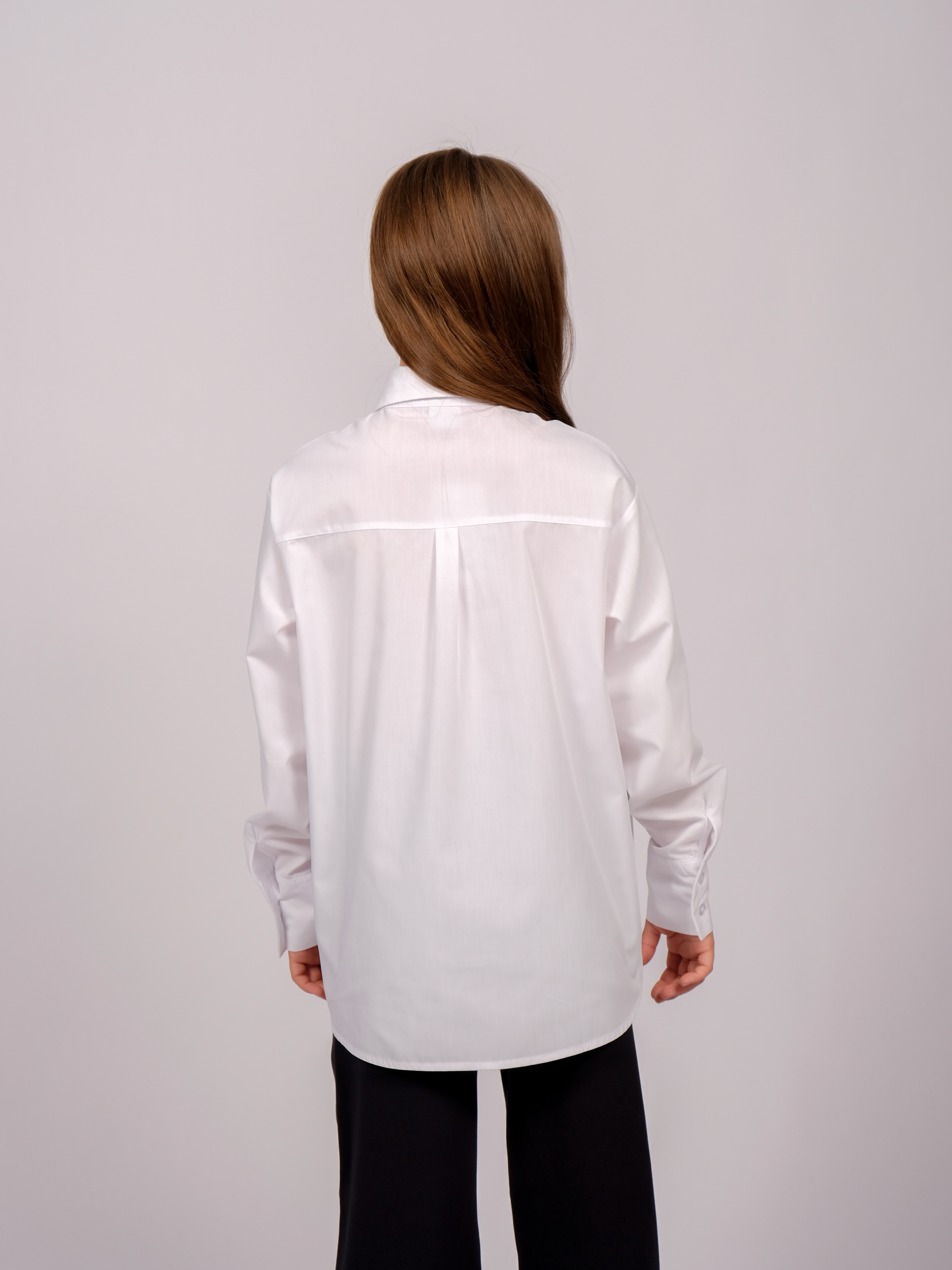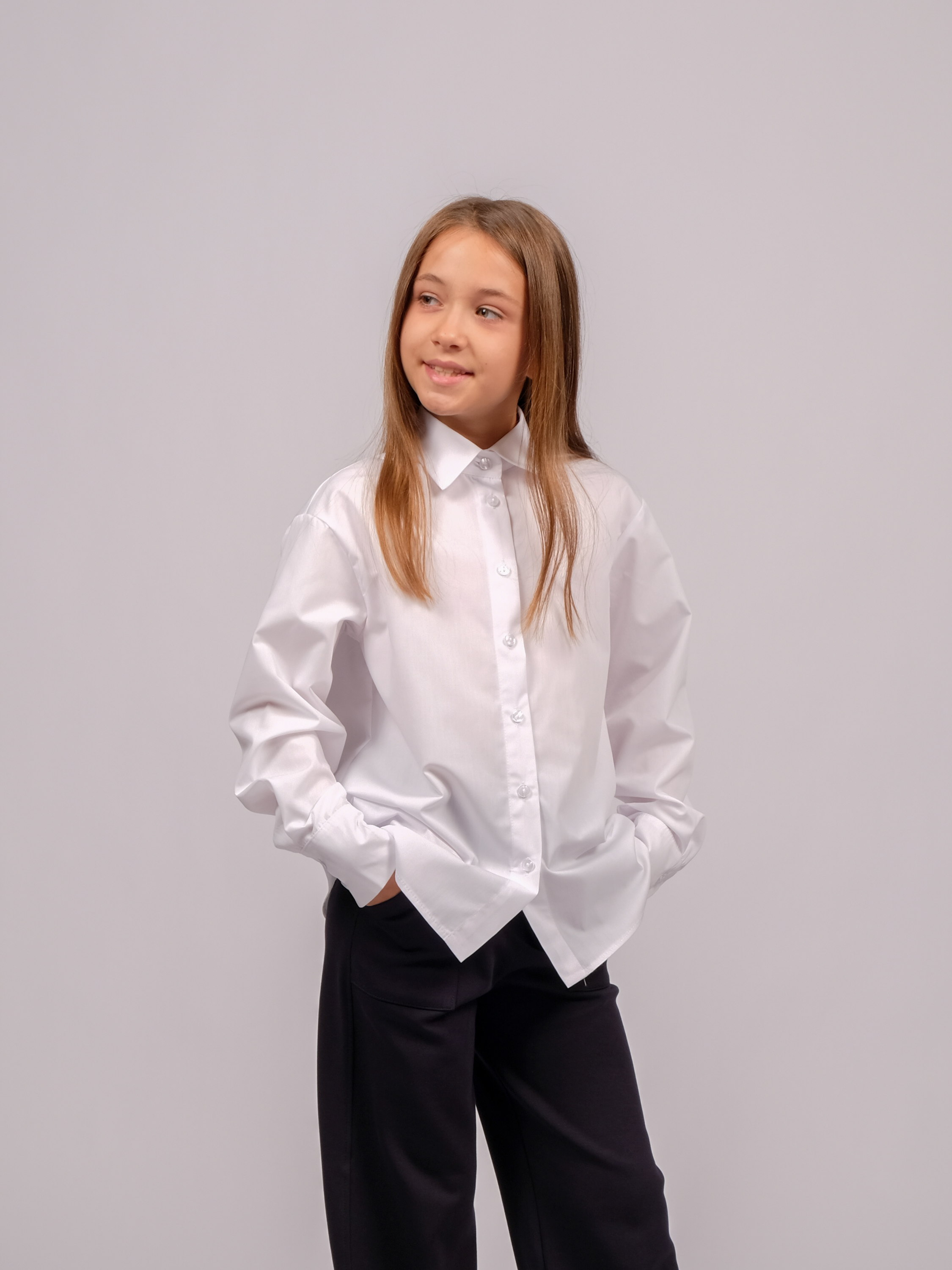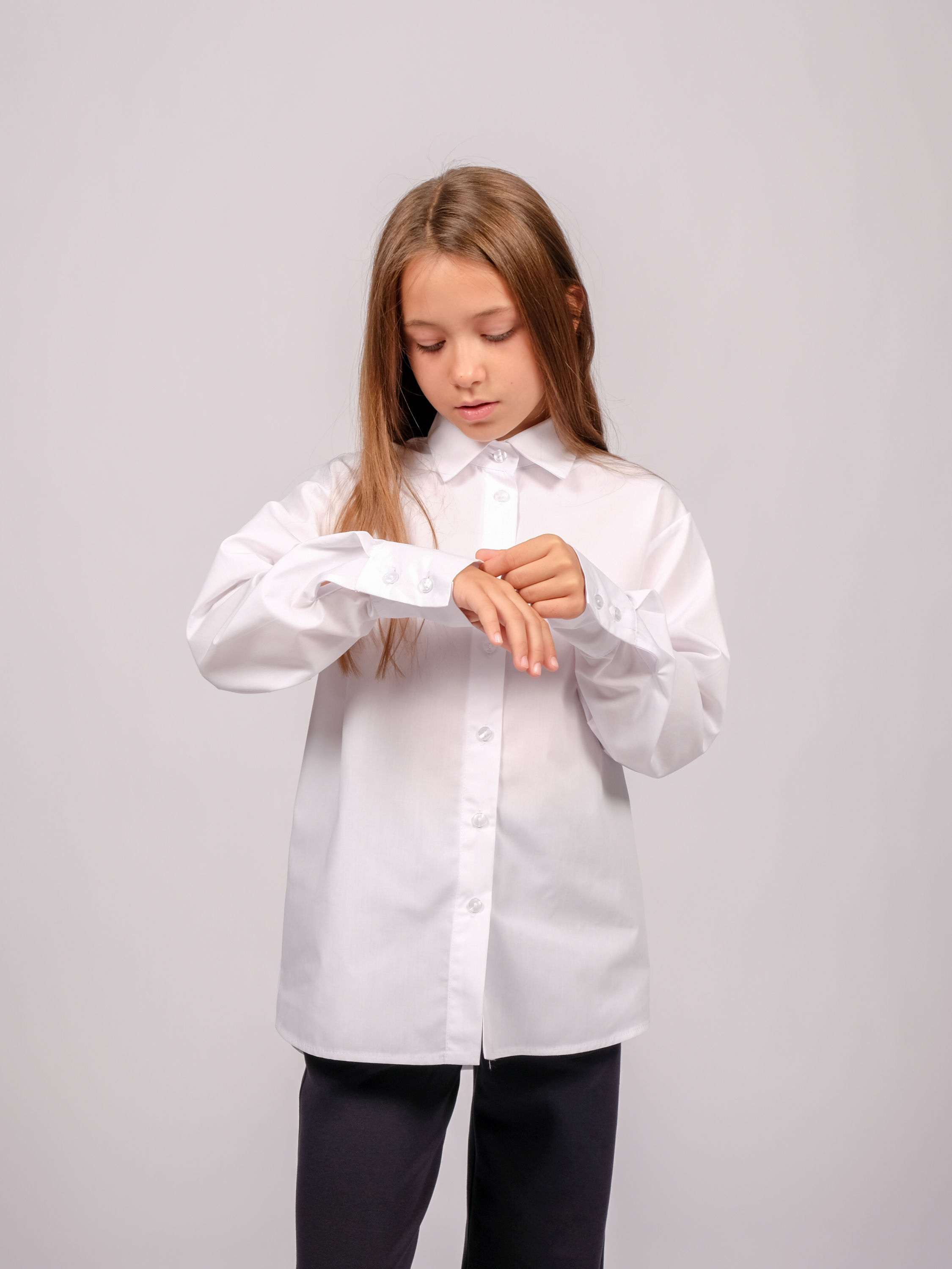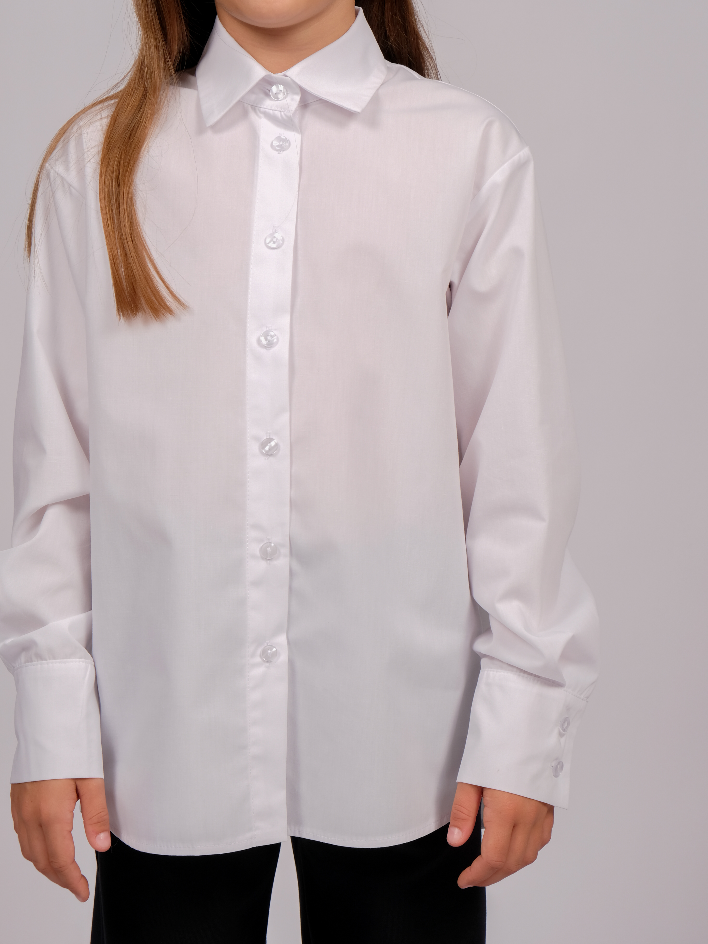 Школьная рубашка для девочки оптом. Модель умеренного объема, прямого кроя, застегивается на пуговицы, рукава с манжетами.