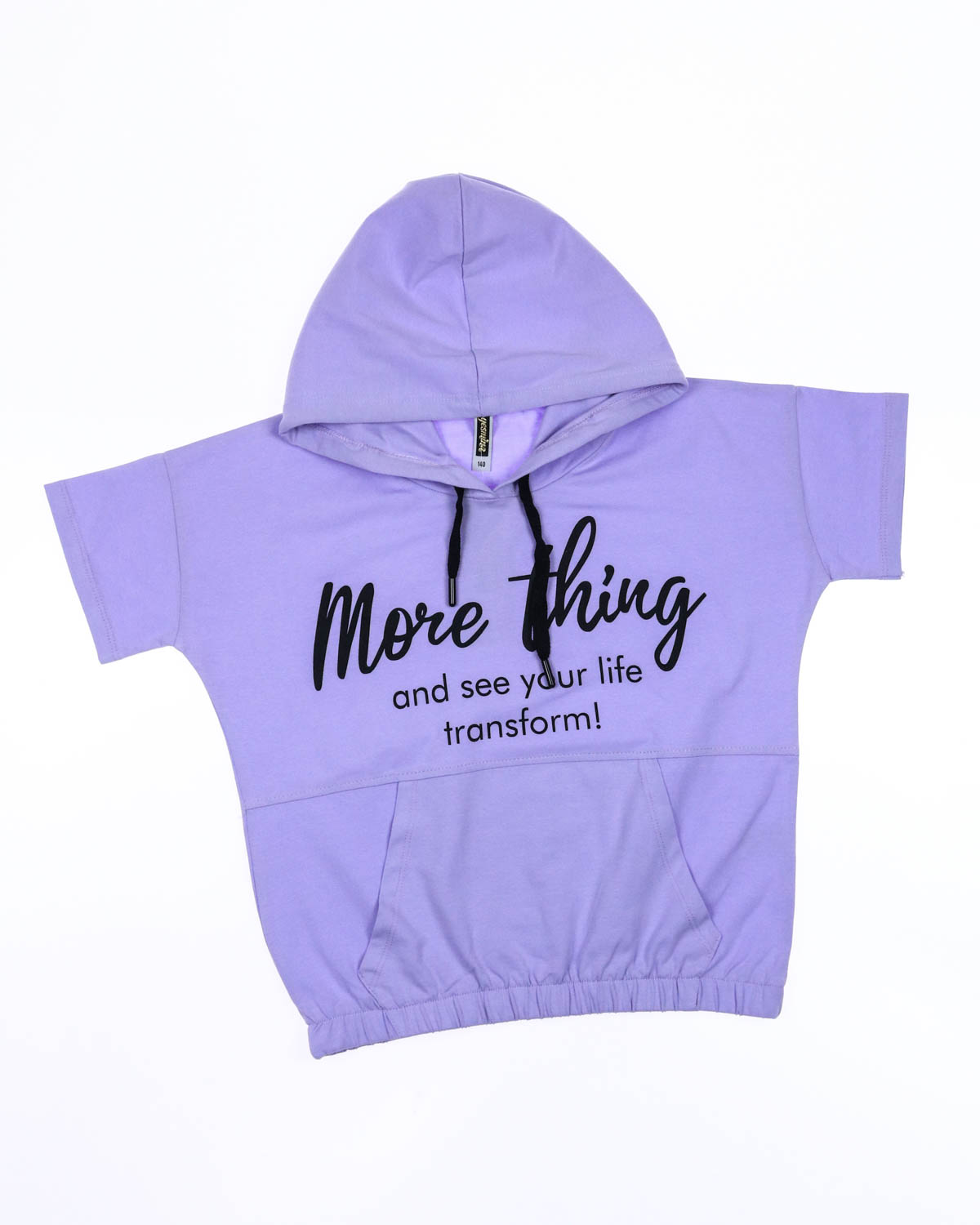 Футболка прямого кроя с капюшоном на резинке. На животе футболки карман по типу кенгуру.