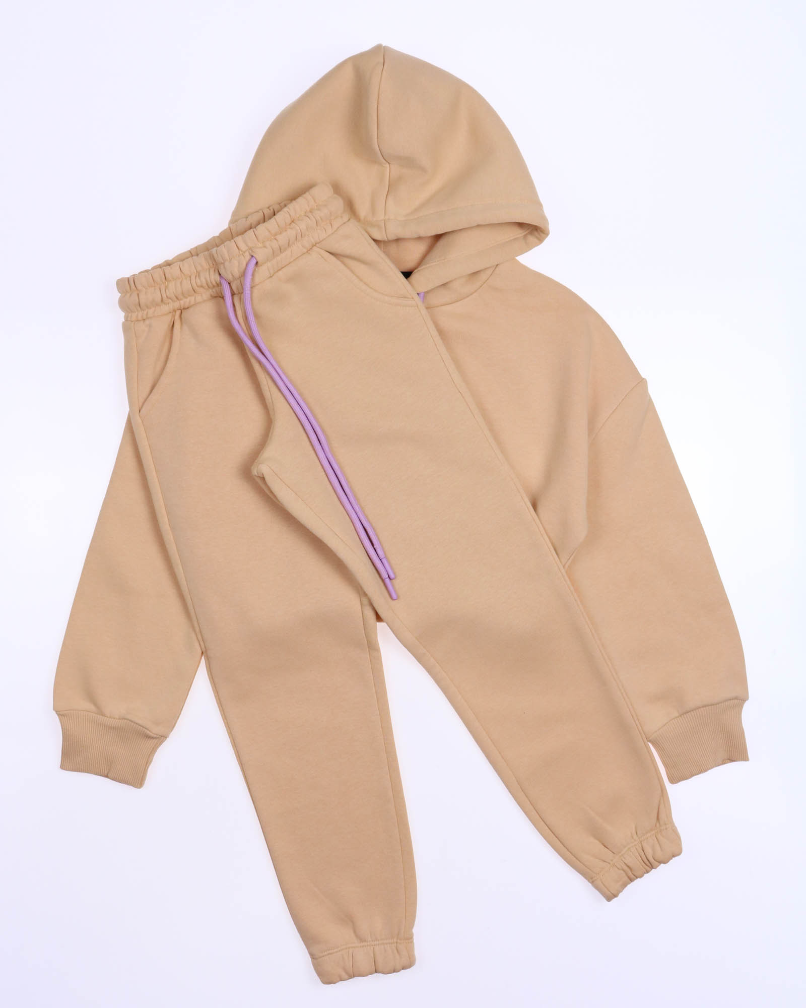 Утеплённый спортивный костюм для девочек в из плотного футера с начесом. Оптимальный объём худи не будет сковывать движений, легко сочетается с верхней одеждой. Худи укороченное на резинке, с объемным капюшоном. Утеплённые брюки на манжетах с боковыми карманами.