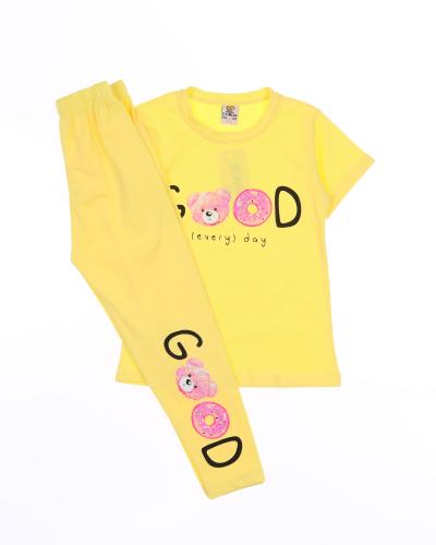 Практичный костюм для девочки оптом состоит из футболки и лосин. Горловина футболки обработана эластичной бейкой. Лосины в поясе на резинке.  Костюм изготовлен из хлопкового полотна кулирка - нежного и мягкого, гипоаллергенного и легкого в уходе. Модель прекрасно подойдет для повседневной носки на улице или дома, для детского сада, а так же для активного отдыха и занятий спортом.
