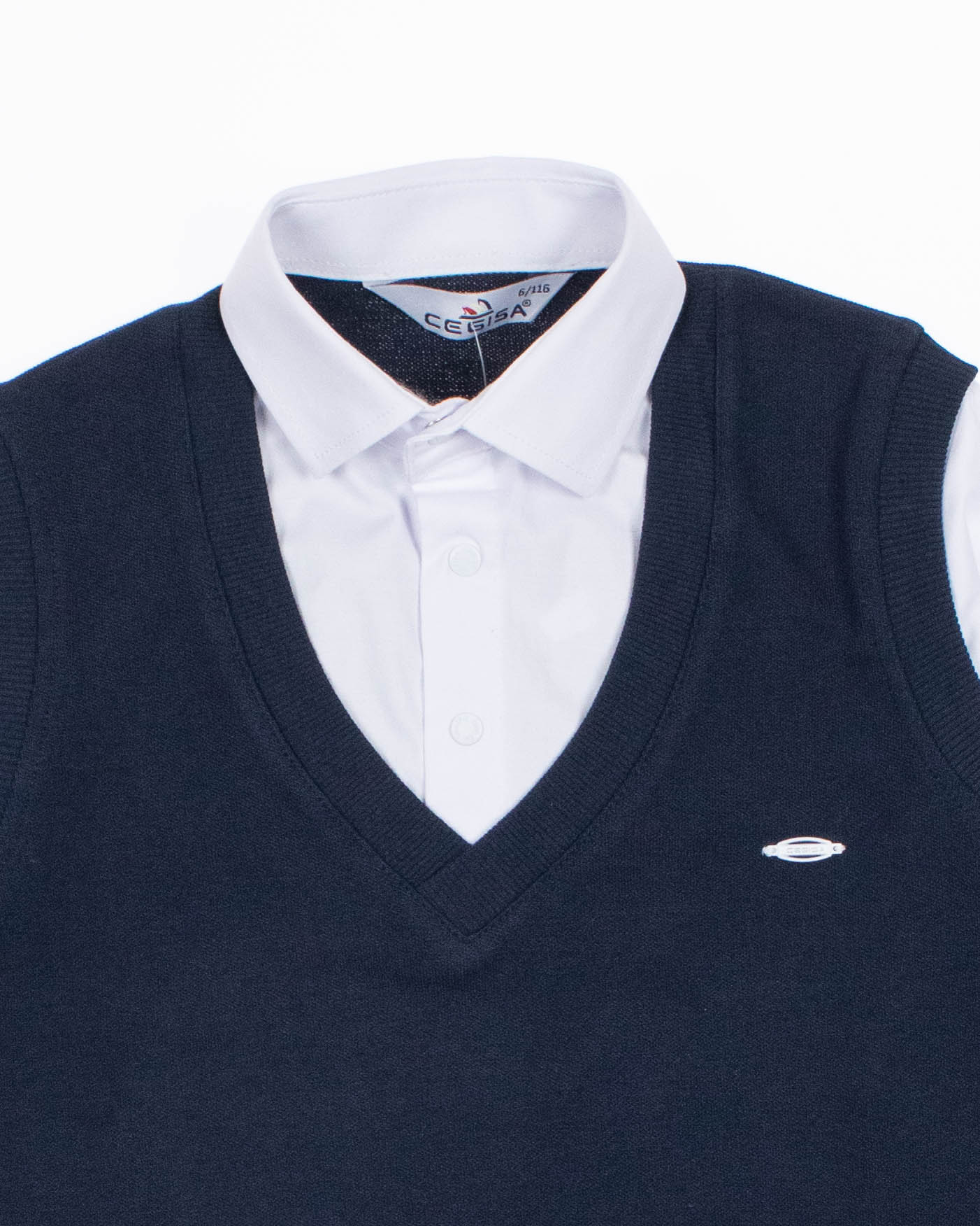 Школьный джемпер-обманка для мальчика оптом с имитацией рубашки выполнен из качественного хлопкового трикотажа с небольшим добавлением лайкры. Ворот сшит из рубашечной хлопковой ткани, застежка-кнопки. Джемпер-обманка выглядит как полноценный комплект рубашки и джемпера. Мальчик будет всегда опрятен в школе, сохраняя при этом официальный дресс-код. Качество наших изделий подтверждают многократные стирки в стиральной машине, при которых жилет-обманка сохраняет прежний вид, без деформации и окрашивания рукавов или ворота. Торговая марка CEGISA представляет большой ассортимент качественной, красивой, классической школьной и спортивной одежды турецкого производства для детей и подростков.