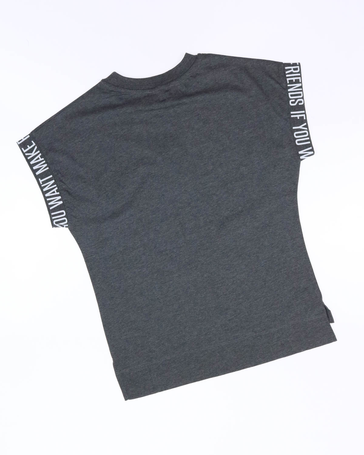Футболка для мальчика свободного кроя со спущенной линией плеча. Рукава оформлены манжетами. Низ футболки ассиметричный с боковыми разрезами, на груди расположена фирменная эмблема.