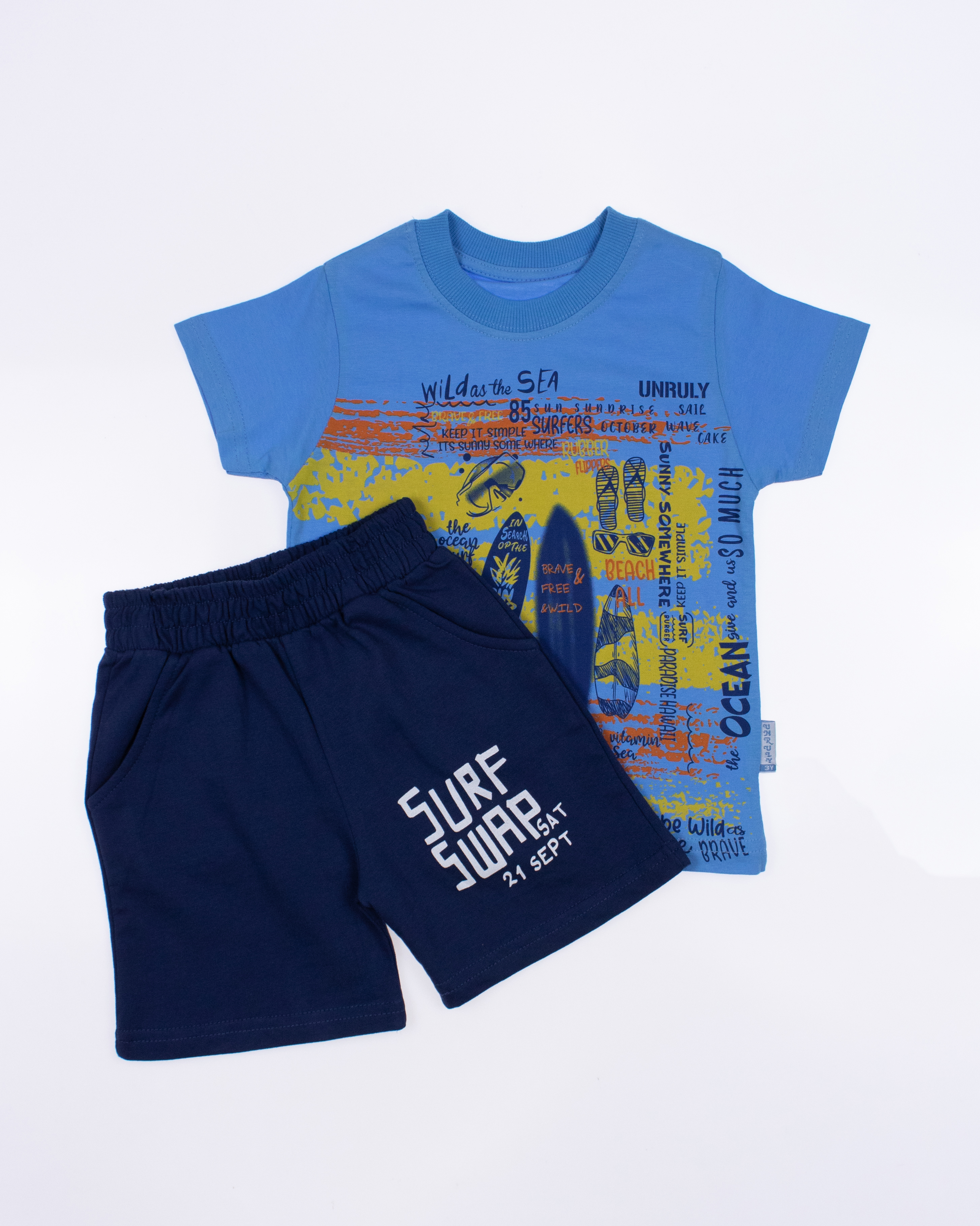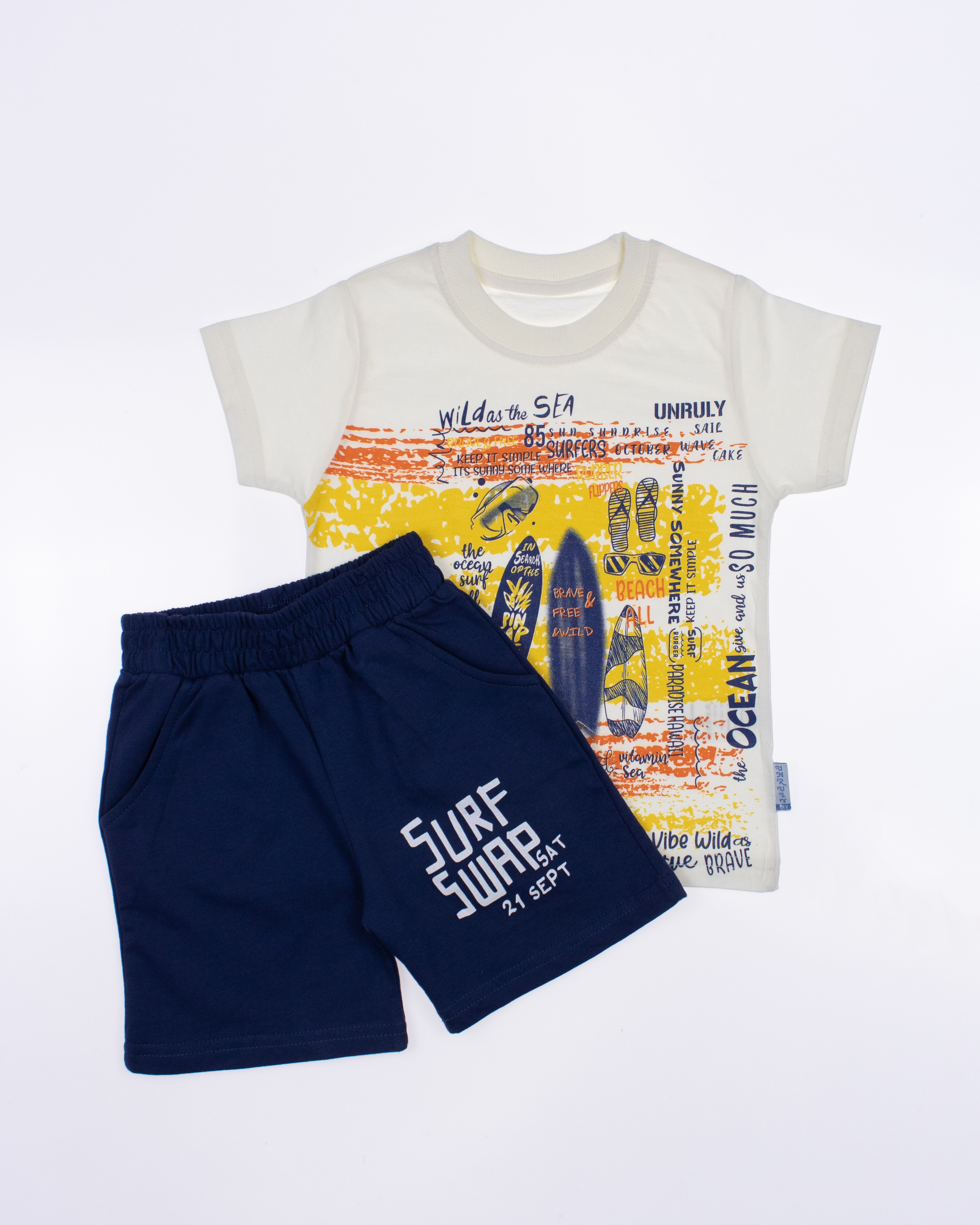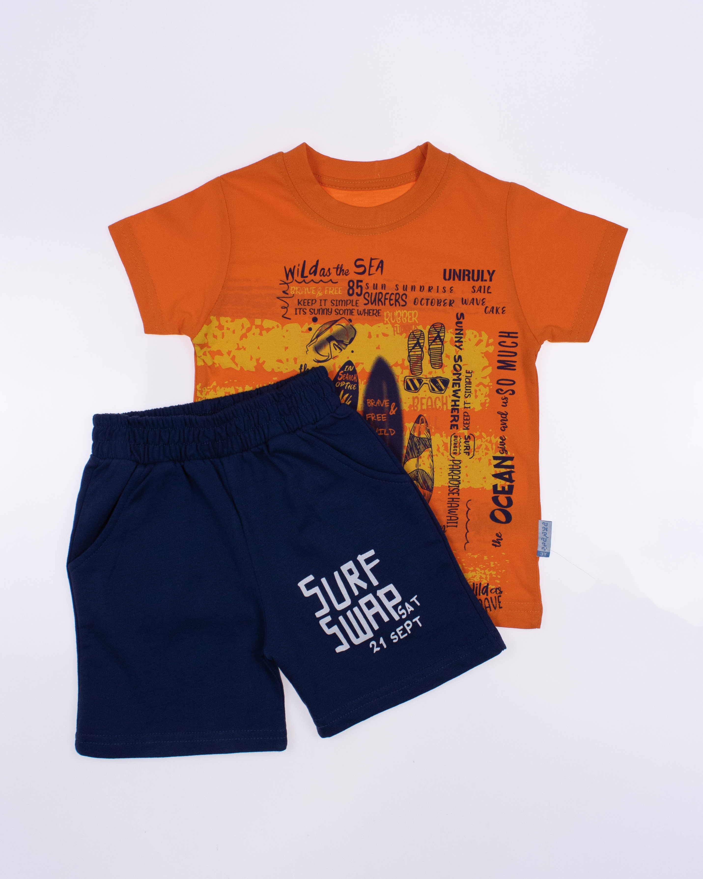 Детский костюм UNRULY выполнен из хлопкового полотна и оформлен печатным принтом. Футболка прямого кроя, с округлым вырезом горловины. Шорты умеренного объема, по бокам два вместительных  кармана.