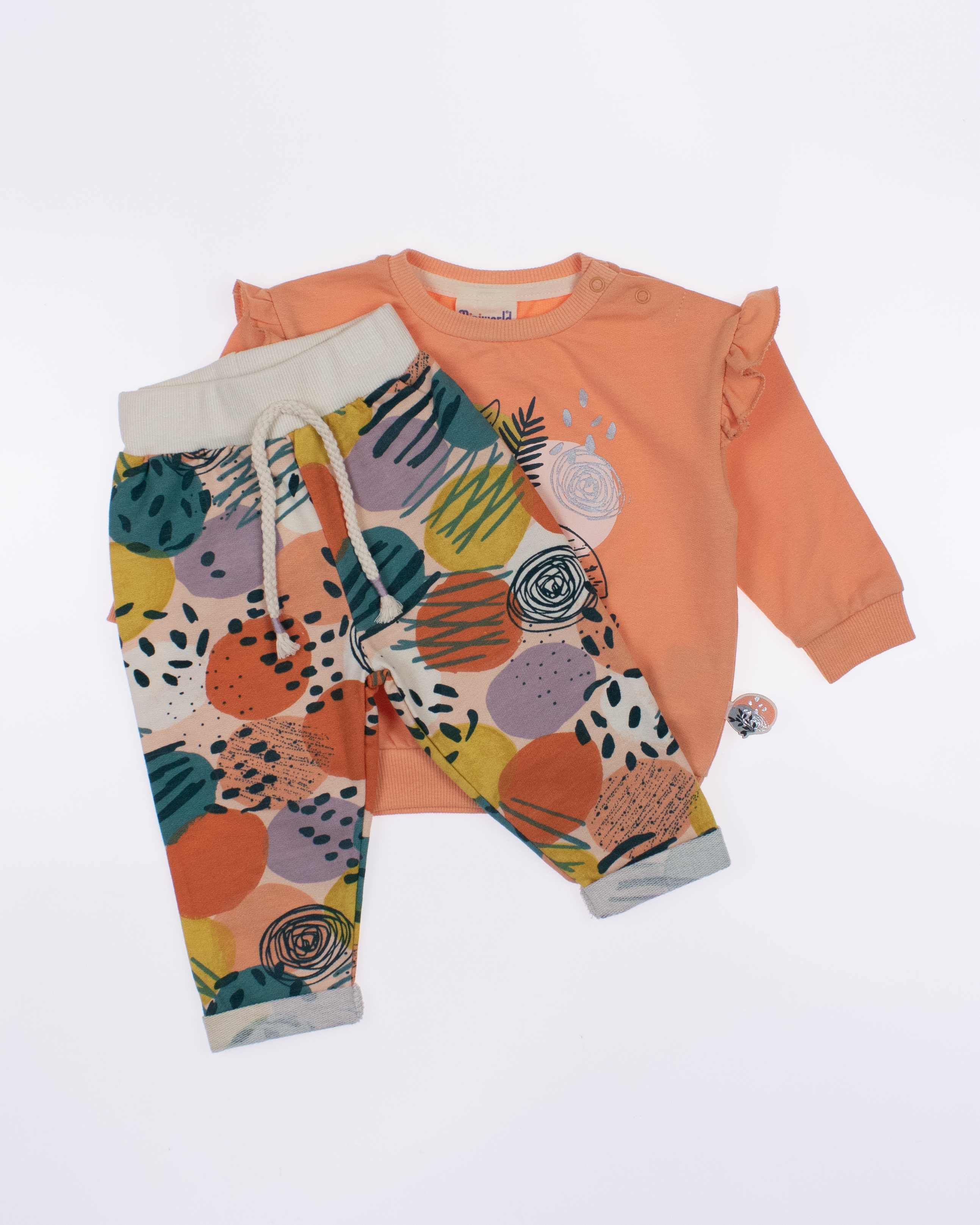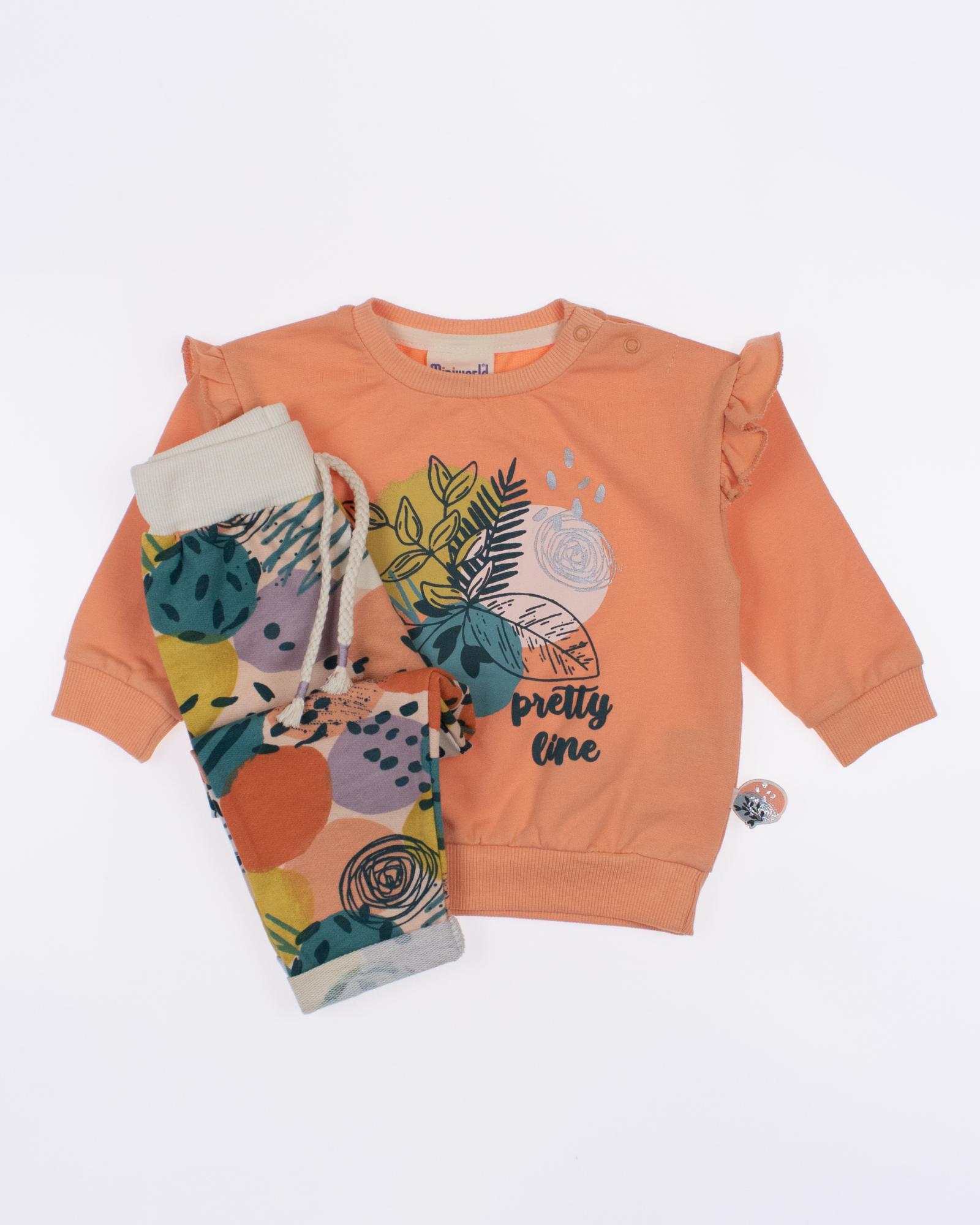 Мы предлагаем оптовые продажи детской одежды производства Турция. Хлопковый костюм  MINIWORLD выполнен из 100% хлопка, что гарантирует комфорт и безопасность для самых маленьких детей. Свитшот имеет удобную застежку-кнопки на плече, что облегчит процесс надевания и снятия одежды. Штанишки с мягкими манжетами на эластичном поясе идеально подходят для ношения с подгузником, обеспечивая свободу движений и комфорт. Детский милый принт на костюме поможет развить фантазию и воображение ребенка, делая его образ ярким и запоминающимся. Костюм MINIWORLD - отличный выбор для маленьких модников и их заботливых родителей. Не упустите возможность приобрести этот уникальный товар оптом по выгодной цене!