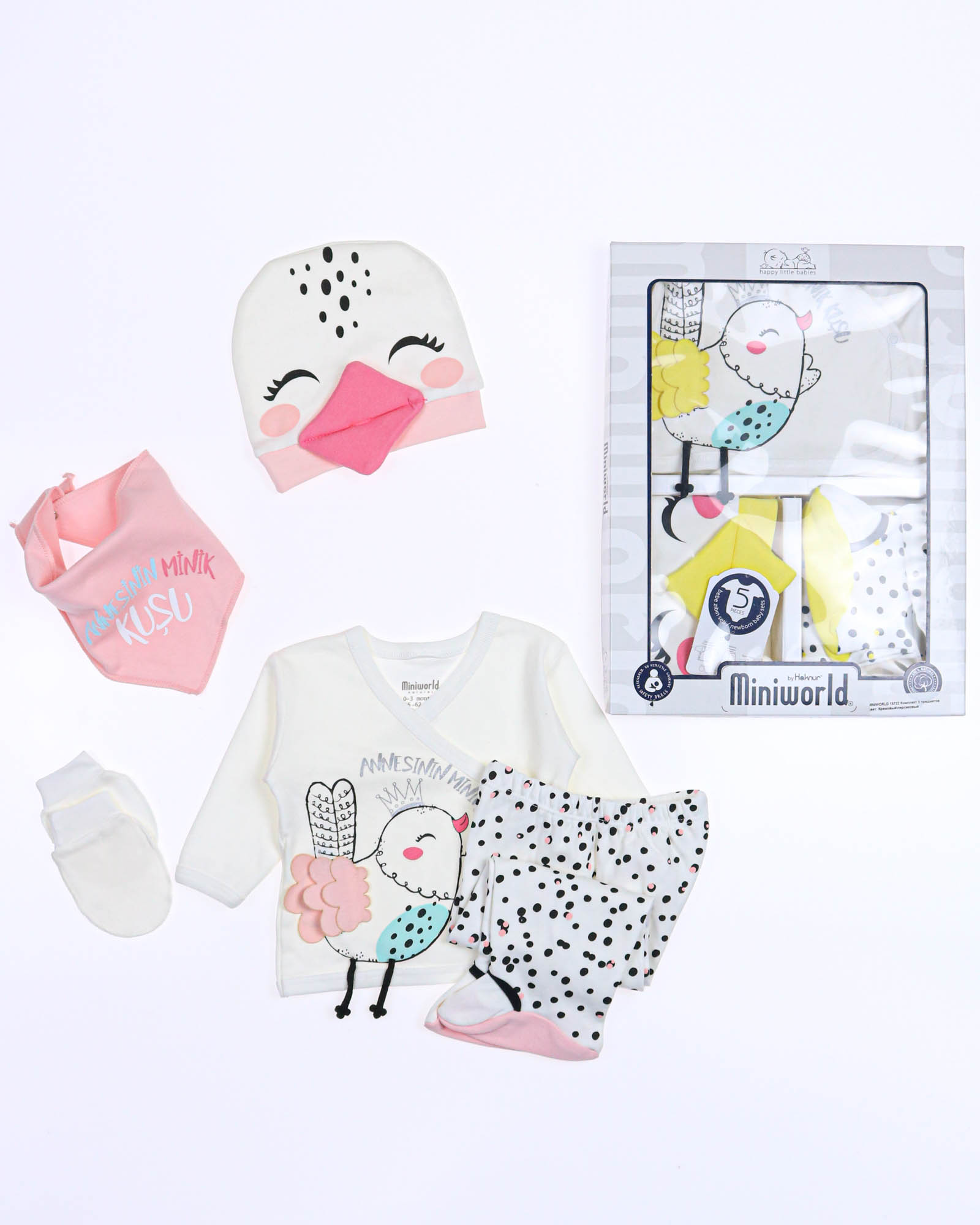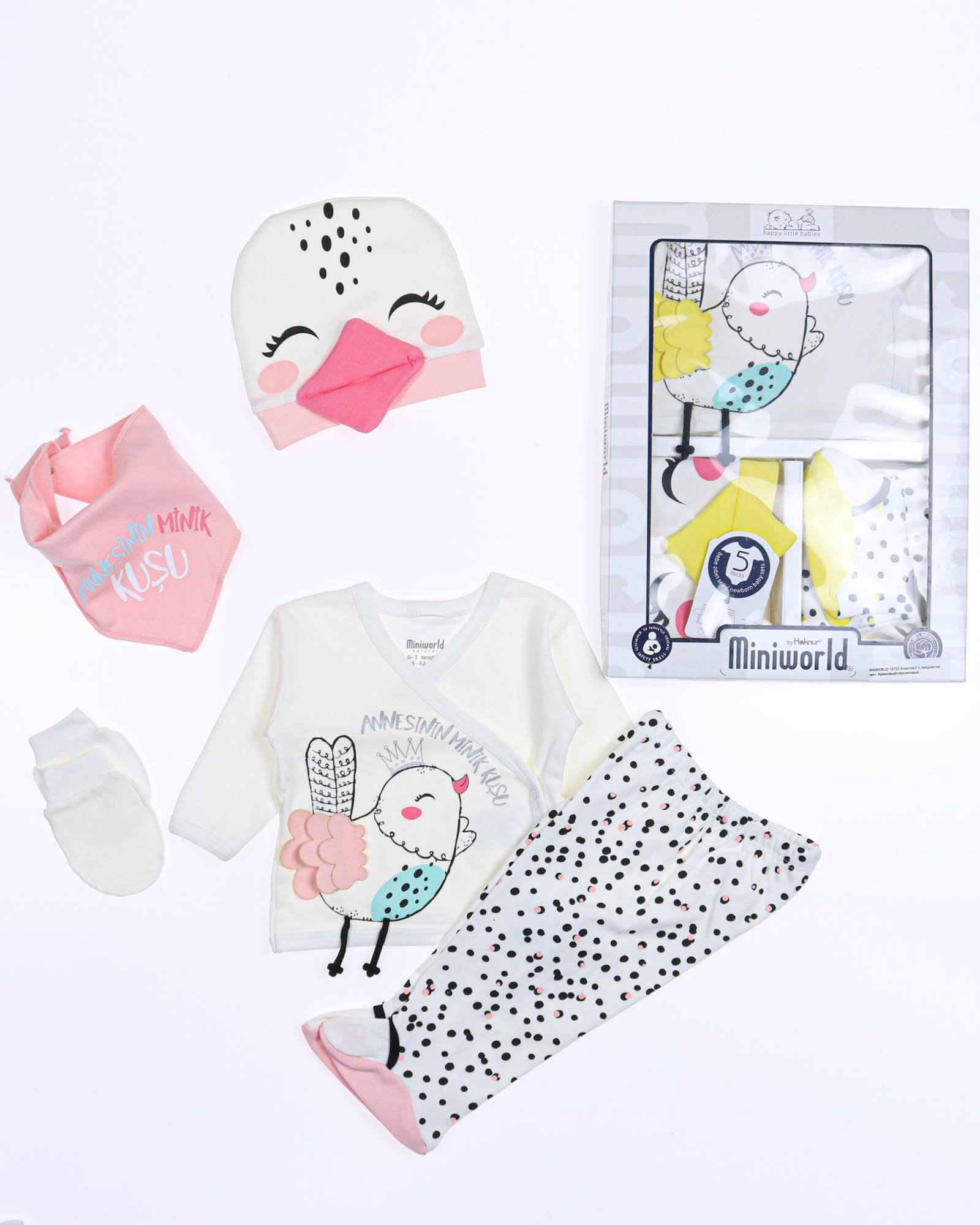Детский комплект для новорожденного ребенка из 5 предметов, упакован в красивую подарочную коробку с прозрачным окошком. В комплект входит : распашонка, рукавички-царапки, слюнявчик, ползунки и шапочка. Комплект  отлично подходит  для первого подарка.